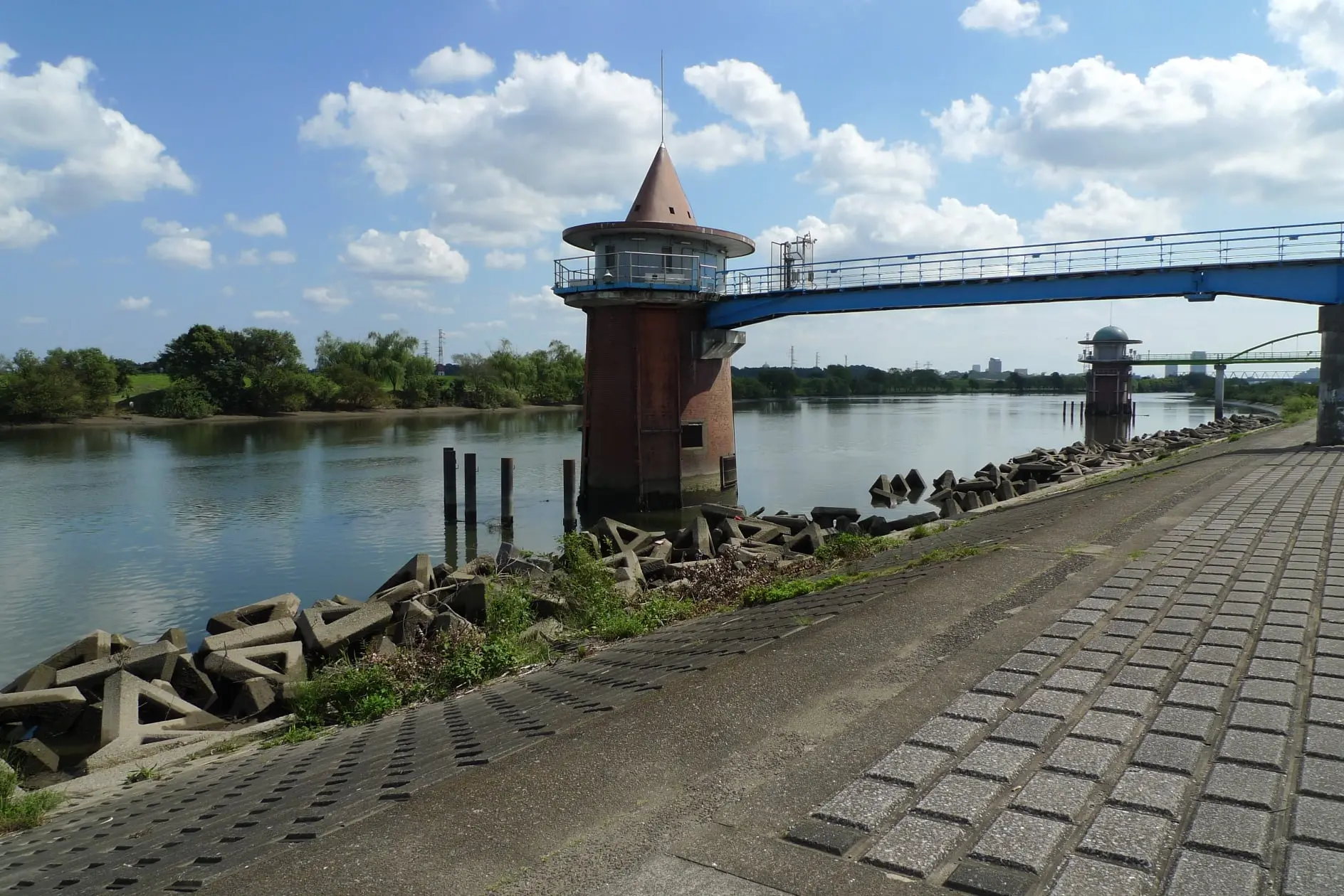 Les premières fois, il l’amenait le long du fleuve Edo, où deux prises d’eau sur la rive ouest à hauteur de Katsushika Shibamata (oui, le fameux quartier de Tora-san) sont affublées de chapeaux. Le premier pointu comme celui d’une sorcière, le deuxième rond comme un chapeau melon.