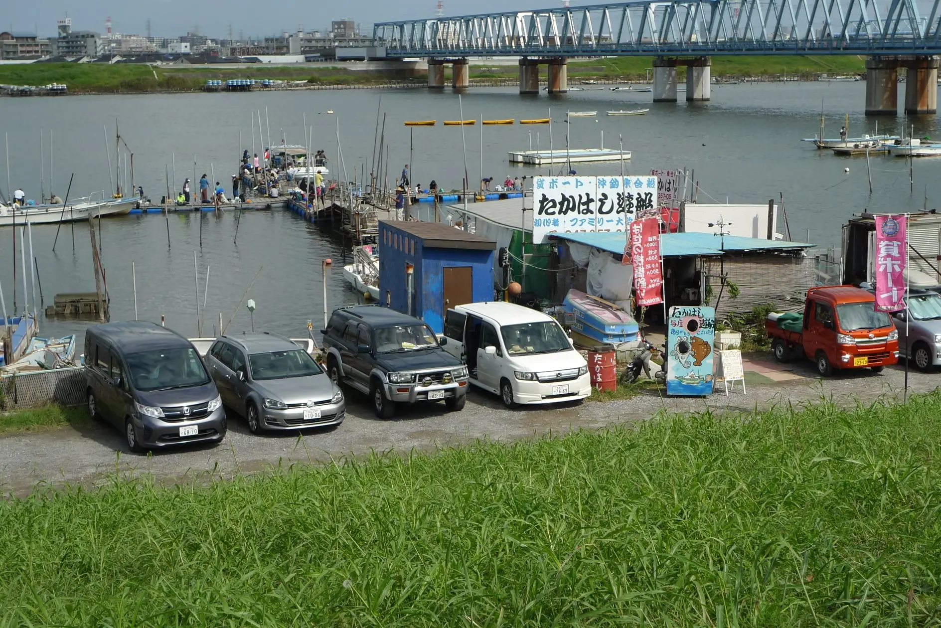 Plus au sud, toujours sur la rive ouest, une baraque loue des embarcations et offre des mini-croisières en famille sur le fleuve, pendant que la radio AM joue les airs anciens d’un Japon d’autrefois.