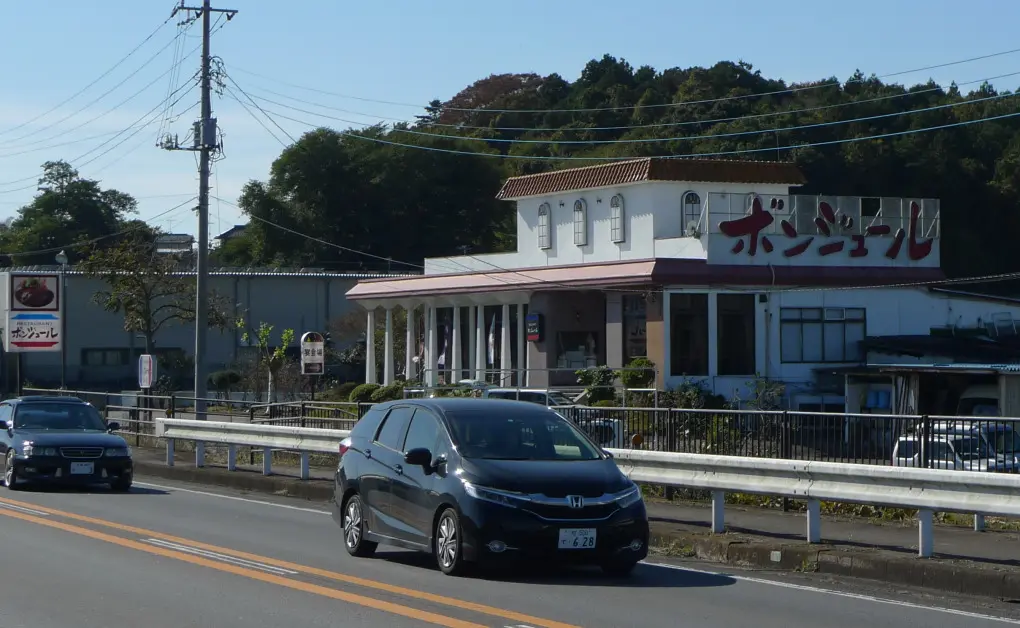 Plus loin, donc toujours plus au sud-ouest, du trottoir d’une route au trafic un peu dense, nous tombons sur un resto appelé « Bonjour » (ボンジュール).