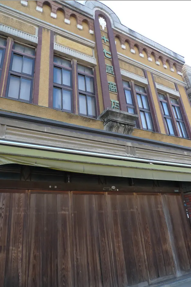 À Ishioka, alors que nous venions à peine de commencer à rouler, nous avons freiné vivement devant la façade d’un magasin, le Jūshichiya-shōten (十七屋商店). Sa construction remonte à 1930.