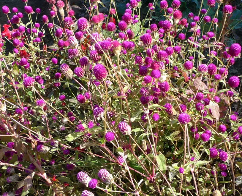 Dans le parc où mon cavalier a fait sa pause du midi, il y avait des fleurs en forme de pompons (ou, vaguement, de petites fraises des champs roses).