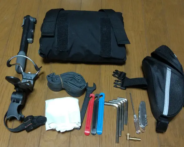 Pour rouler en ville et près des gares avec un vélo pliable, un simple rinkōbukuro (輪行袋) suffit, mais dès qu’on s’éloigne un peu il vaut mieux prévoir les coups durs. Moi, je ne pars jamais sans un porte-bouteille et tous les outils adaptés à mes vis et boulons. J’apporte aussi une mini-pompe et un adaptateur pour vélo d’enfant (autrement, impossible de refaire le plein d’air sur un vélo à roues de 14 pouces, les rayons sont tellement près l’un de l’autre que la tête de la pompe ne passe pas), tout ce qu’il faut pour remplacer la chambre à air, un petit couteau suisse et un chiffon (au cas où j’aurais besoin de tripoter ma chaîne).