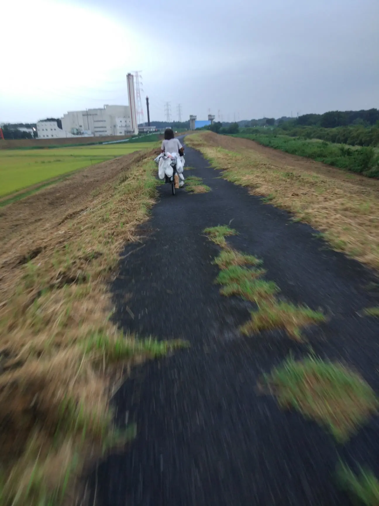 Parfois, et surtout sur les rives du fleuve Tone (利根川), la piste est tout juste suffisamment aménagée pour permettre les petits déplacements quotidiens des résidents locaux, ou à ceux du sans-abri du coin, espèce rare de la faune environnante qui, sur cette photo, se faufile entre les herbes et les fissures à hauteur de la ville de Kashiwa (préfecture de Chiba).