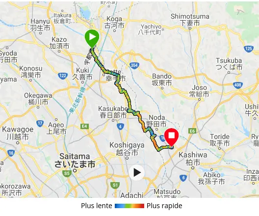 La météo annonçait des vents puissants pour toute la journée de samedi, en provenance du nord-ouest. Grincheux et moi avons donc décidé de prendre le train jusqu’à la gare Kurihashi (栗橋駅) et de nous laisser pousser dans le dos jusqu’à la maison sur un peu moins de 50 km, en traversant ou longeant les villes de Kuki, Satte, Kasukabe et Noda (久喜市、幸手市、春日部市、野田市).