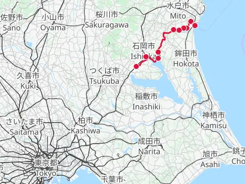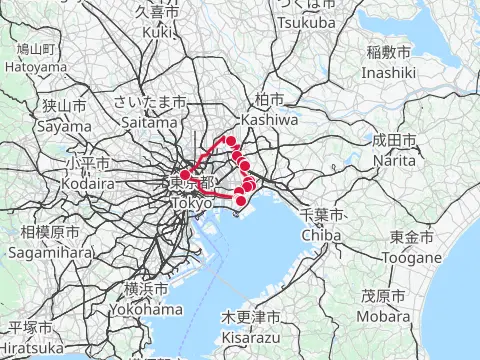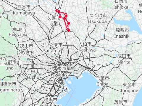 Balade pour aller admirer les lycoris rouges sur la digue Gongendō à Satte. Dans cette balade, les cyclistes longent le cours de la rivière Nakagawa, du canal de drainage Nakashōnai et du fleuve Edogawa, avec comme option la visite des installations de sauce soja à Noda. La balade se termine à la gare de Kashiwa-Tanaka, pour un retour rapide au centre-ville de Tokyo.
