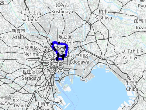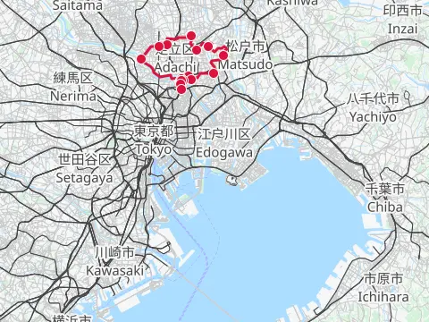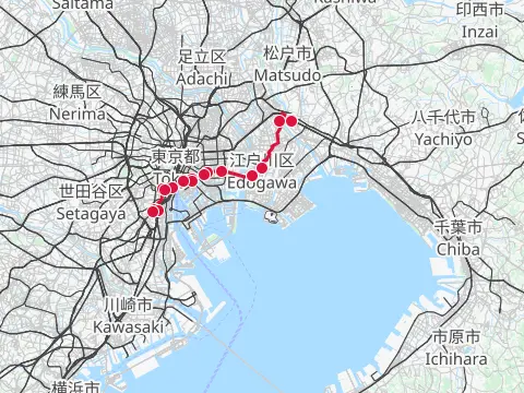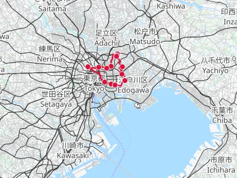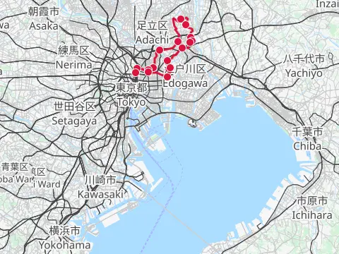 Balade qui passe par trois des lieux célèbres de la capitale peints par Hiroshige. C’est aussi un petit voyage à vélo le long de nombreux cours d’eau de Tōkyō (Sumidagawa, Arakawa, Nakagawa, Kyū-Edogawa et Edogawa), au parc Satomi pour y contempler les roses et au parc Mizumoto pour y observer les oiseaux sauvages.