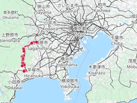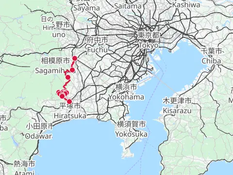 Balade sous les feuillages automnaux des collines de Tama. Elle passe principalement par les délicieux paysages d’autrefois dans les rizières de bas-fonds d’Onoji, puis est suivie d’une descente par l’ancienne route de Daikanzawa. Le trajet emprunte ensuite, en montant, le sentier vert Oneriryokudō (de son surnom la « route des chars d’assaut ») pour aller contempler la couverture végétale automnale, puis, en atteignant la rivière Sakaigawa, prend la direction de Hashimoto. Un trajet très plaisant agrémenté du craquètement des feuilles mortes sous les roues et de l’alternance des petites montées et descentes…