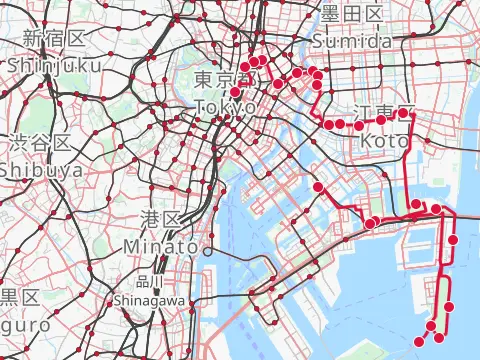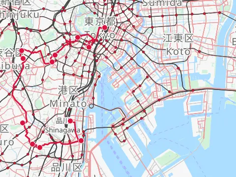 Balade à travers cinq des cent vues célèbres d’Edo, toutes les cinq peintes par Hiroshige à l’extrémité sud de la capitale, dont l’estampe intitulée « Le transbordeur à Haneda et le sanctuaire de Benten ». Le tracé passe d’abord par le pont Suidōbashi au cœur de Tōkyō, puis, à Shinagawa, emprunte l’ancienne route du Tōkaidō, qu’il suit vers le sud en direction de Haneda, en passant par Samezu, Ōmori et Kamata. L’après-midi, la balade se poursuit sur la piste cyclable du fleuve Tamagawa, qu’elle quitte ensuite pour boucler la boucle via l’étang Senzoku.