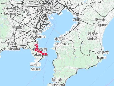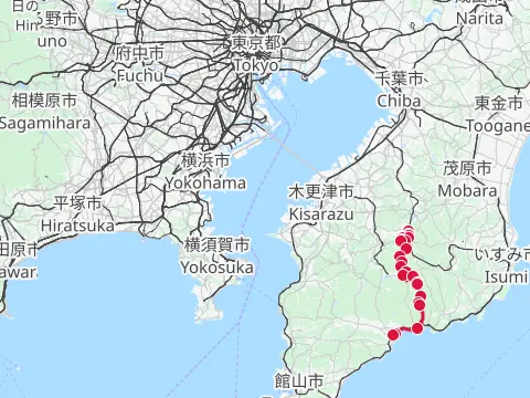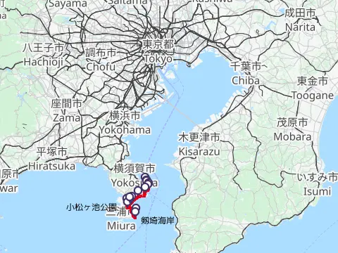 Cette balade commence par une petite traversée à bord du transbordeur du port de Miura (400 yens par personne, 50 yens par vélo), puis les cyclistes vont visiter le phare Tōmyōdō et les vestiges de la batterie de Chiyogasaki. Le groupe longe ensuite littoral de la péninsule de Miura, traverse des champs de radis blancs japonais, puis se rend à Tsurugizaki pour folâtrer sur les couches stratigraphiques côtières.