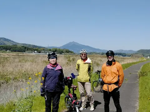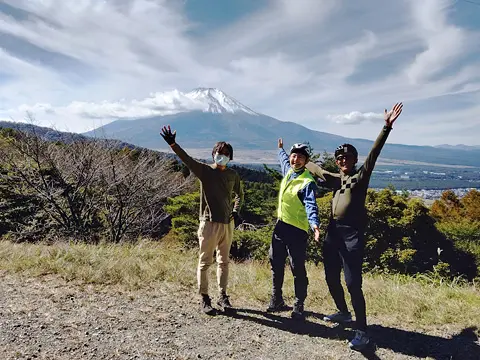 Une balade dont le tracé passe par le col Nijūmagaritōge, célèbre pour sa vue splendide sur le mont Fuji. Départ de la gare Higashikatsura, et ascension jusqu’au col en longeant d’abord la rivière Shishidomegawa. La balade se poursuit ensuite jusqu’aux étangs d’eau de source d’Oshino Hakkai, puis sur la piste cyclable du lac Yamanaka-ko jusqu’à la plage Hirano-no-hama, où le groupe a la surprise d’apercevoir un cygne de stature imposante. La balade se termine à la gare Gotemba, en passant par le col Mikunitōge.