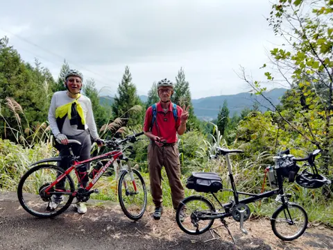 D’agréables balades à travers les feuillages automnaux agrémentées de moments de détente au onsen et de dégustation des délices de la mer. Les quatre cyclistes succombent au charme des feuilles d’automne aux environs du Pont des rencontres (Deai-bashi) à Yugashima, ainsi qu’aux abords de la rivière Katsuragawa, à partir du temple Juzenji. Au menu : de nombreuses montées et descentes à vélo, une vue panoramique imprenable de 360 degrés sur les champs de bambous Sasa veitchii depuis le col de Nishina et des vues splendides sur la baie de Suruga et le mont Fuji.