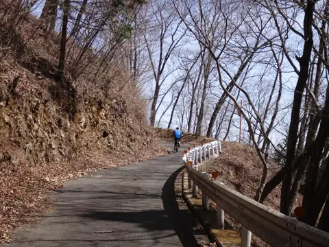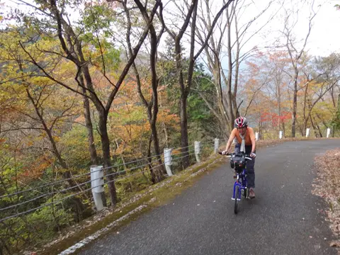 Un trajet de niveau de difficulté supérieur via deux cols à franchir. À partir de Uenohara, le tracé se dirige d’abord vers le col Tsurutōge dans une longue ascension parsemée de hameaux isolés et suivie d’une descente jusqu’au village de Kosuge. Cette traversée du col est suivie d’une montée ardue jusqu’au col suivant, Matsuhimetōge, en contemplant les feuillages automnaux du mont Kumotori, puis le mont Fuji. La balade se termine avec fougue dans une descente dynamique qui, en passant par le barrage Fukashiro, se termine à Ōtsuki.