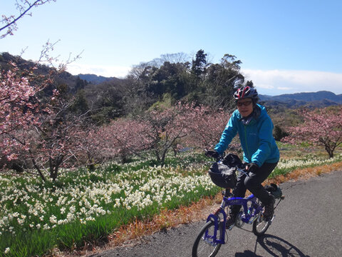 Cette balade se déroule sous le thème des narcisses et des cerisiers Ganchō sur la Route des narcisses d’Ezuki et au Pays des narcisses d’Okuzure. Ensuite, à partir des rizières en terrasses d’Ōyama-Senmaida, les cyclistes grimpent jusqu’au point le plus élevé du mont Atago, redescendent jusqu’au Pacifique, puis terminent la journée en allant contempler les cerisiers Ganchō du parc Hōkoen.