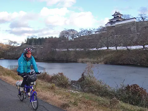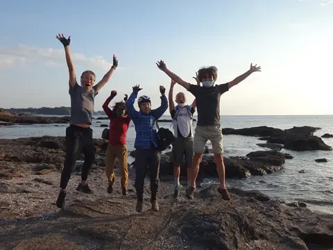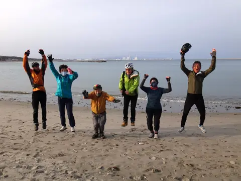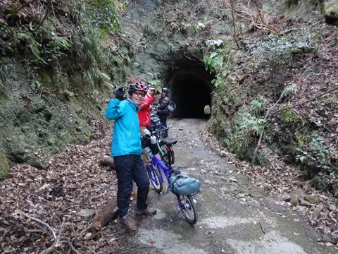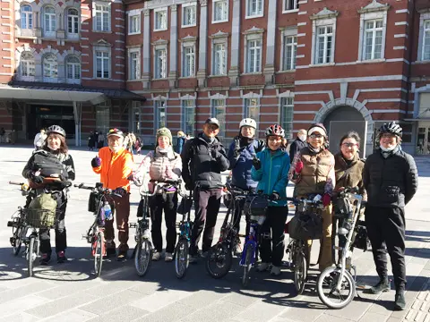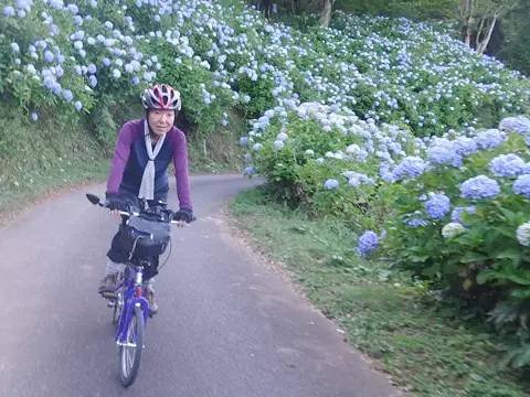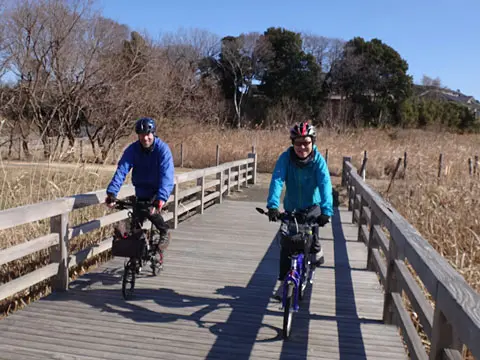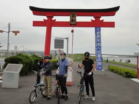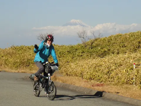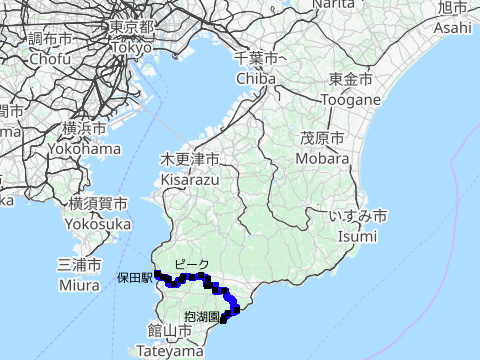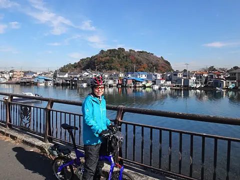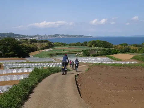 Cette balade commence par une petite traversée à bord du transbordeur du port de Miura (400 yens par personne, 50 yens par vélo), puis les cyclistes vont visiter le phare Tōmyōdō et les vestiges de la batterie de Chiyogasaki. Le groupe longe ensuite littoral de la péninsule de Miura, traverse des champs de radis blancs japonais, puis se rend à Tsurugizaki pour folâtrer sur les couches stratigraphiques côtières.