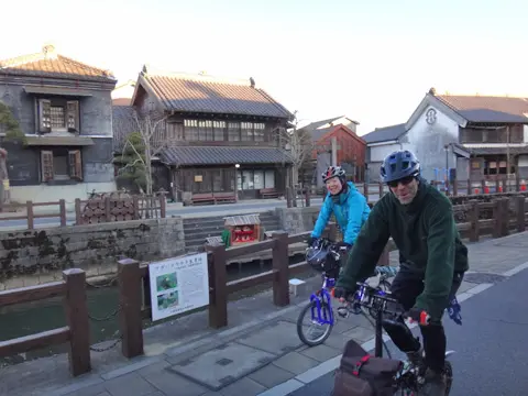 Dans cette balade, les trois cyclistes visitent d’abord le village historique de Bōsō à Narita, reproduction grandeur réelle d’un village avec ses commerces, ateliers d’artisans et résidences de samouraï. L’après-midi, roulant à travers les rizières endormies, ils s’arrêtent un instant au splendide temple thaïlandais « Wat Paknam Japan », puis terminent la journée en beauté dans les rues de la petite Edo de Sawara.
