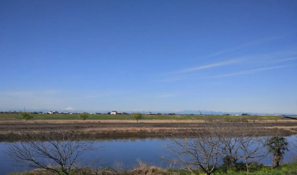 Tout au loin, à l’ouest, le sommet enneigé du mont Fuji.