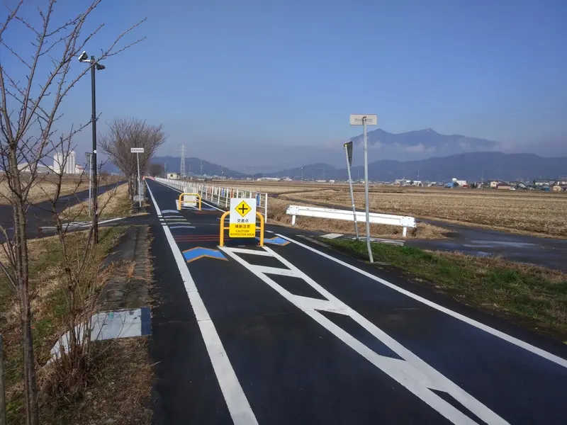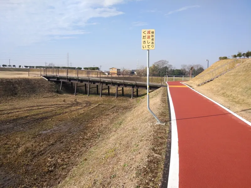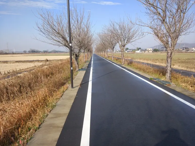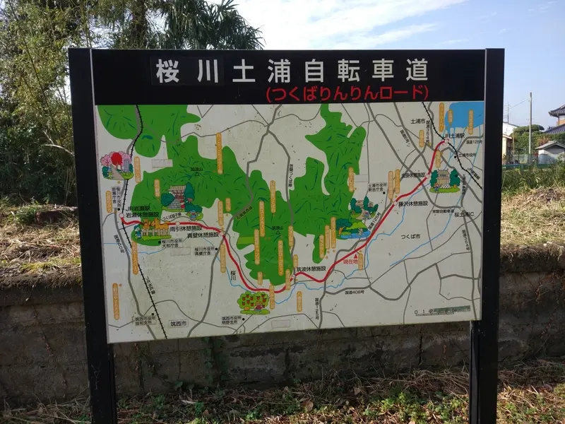 Après quelques kilomètres vers le nord-est, nous avons rejoint la RinRin Road et pris la direction du mont Tsukuba, vers le nord-ouest, contre le vent (向かい風). La RinRin Road, c’est en quelque sorte l’autoroute des vélos. C’est aussi, et ça explique la qualité du trajet, l’ancienne ligne de chemin de fer Tsukuba.