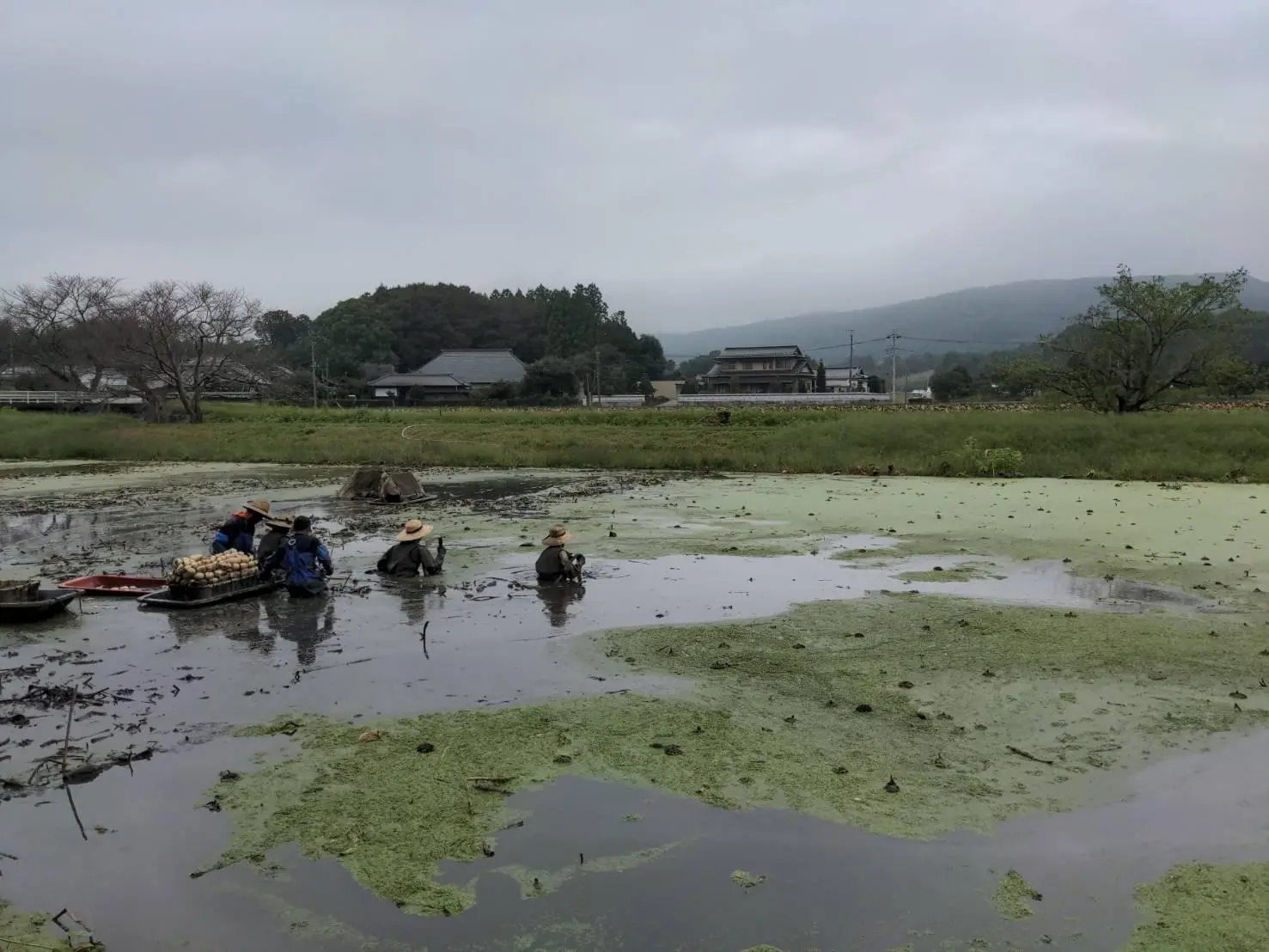 Sortie à vélo, hier, dans la préfecture d’Ibaraki. Dans les champs de rhizome de lotus (renkon), c’était la saison des récoltes. De l’eau jusqu’à la taille, ces travailleurs étrangers asiatiques récoltaient le rhizome avec le sourire. Ils ont bien voulu me laisser prendre une photo de dos…