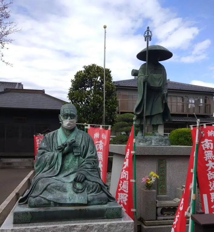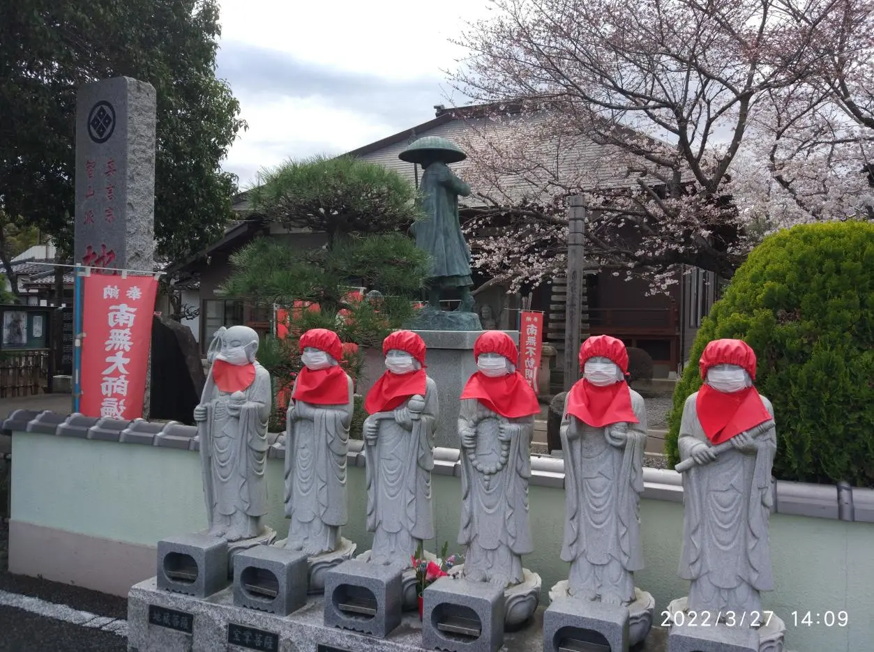 Après cet inébranlable apprenti caméléon, nous sommes passés devant le temple Jizōin (地蔵院) et avons pénétré dans l’enceinte complètement déserte, si ce n’est quelques jizō, tous bien protégés contre le virus.