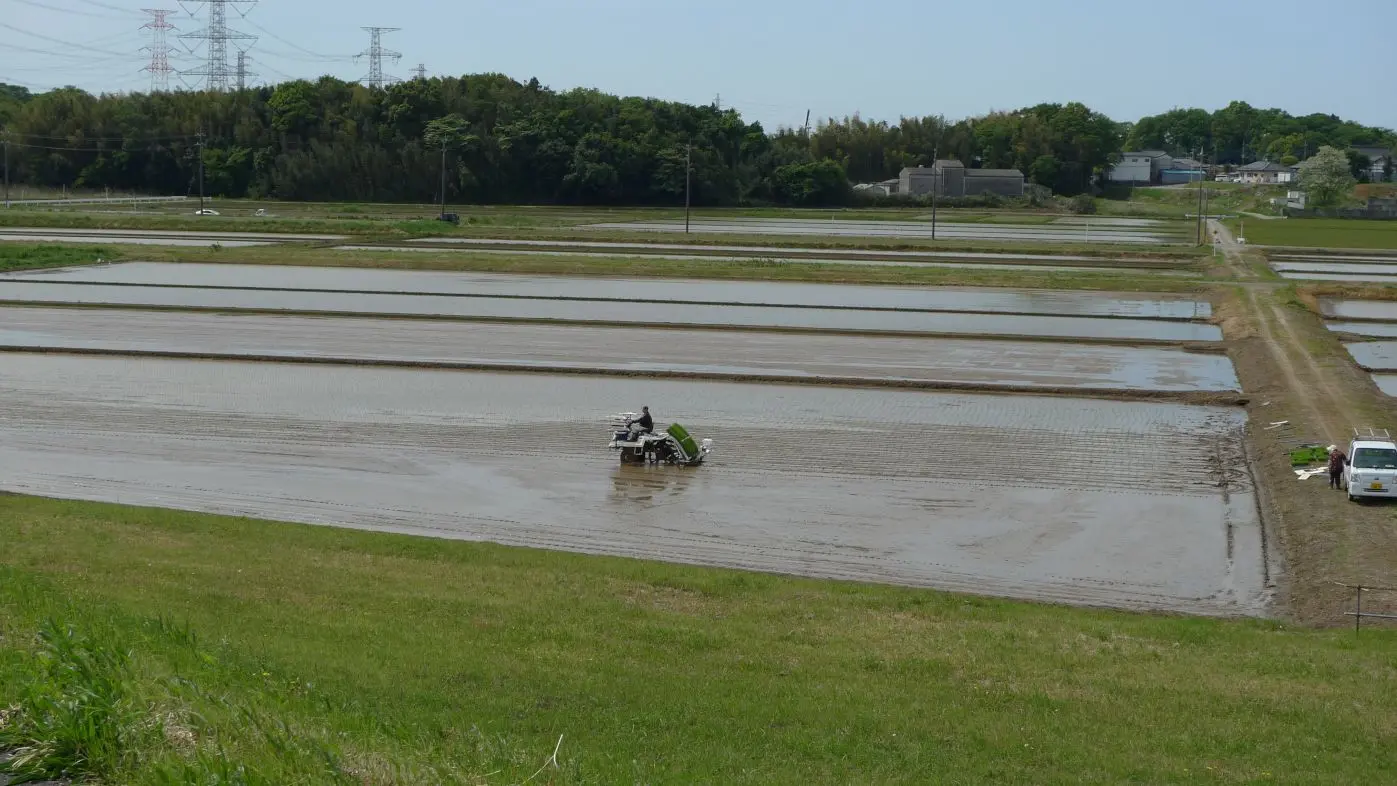 J’aperçois bientôt un cultivateur sur sa repiqueuse motorisée. Dommage, le zoom de mon Lumix DMC-LX3 manque de puissance, sinon on verrait bien (mieux) les plants de riz à l’arrière de la machine. Il faut savoir que le riz est d’abord planté en un tas bien serré dans un petit coin de la rizière. On l’y laisse pousser jusqu’à la hauteur désirée (comme sur la photo d’hier), puis on le charge à l’arrière de la repiqueuse pour le replanter dans la boue du champ irrigué. Le niveau d’eau est contrôlé par des robinets d’irrigation et des canaux d’évacuation tout autour des parcelles. Dans quelques semaines on ne verra plus l’eau, tout serra d’un vert uniforme et ondulant dont on ne se lasse jamais. En tout cas pas moi.