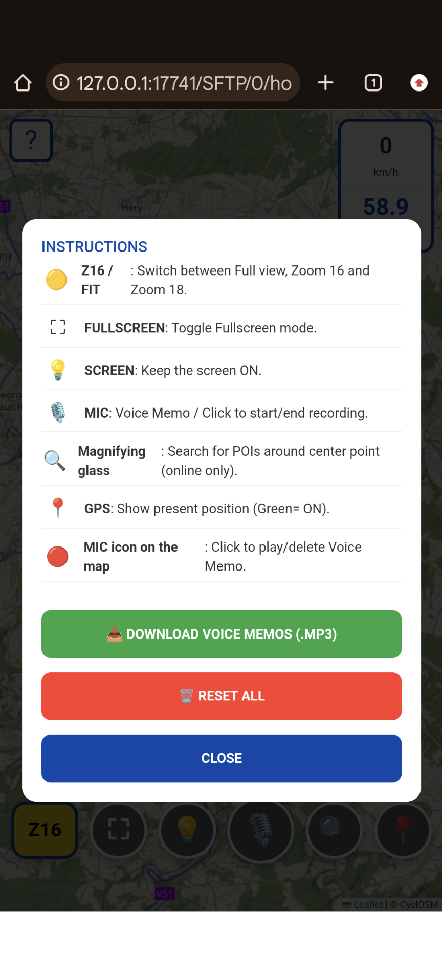 With the yellow icon in the bottom left corner, you can choose your zoom level. Each press toggles the zoom between the route overview, the downloaded tiles zoom (16x), and an 18x zoom, which is a browser-level zoom (the image blurs slightly but remains clearly visible). For navigating open countryside, zoom 16 is perfect for a general idea of what’s coming, while zoom 18 helps avoid mistakes at intersections—very practical in the city.
