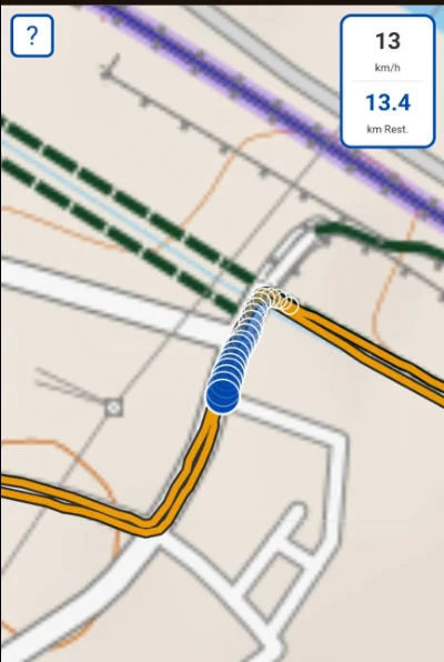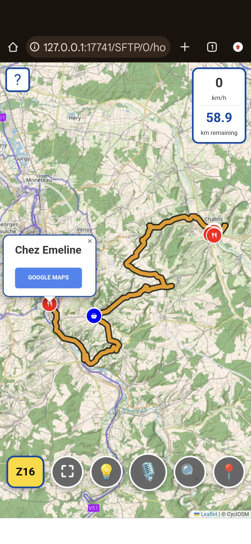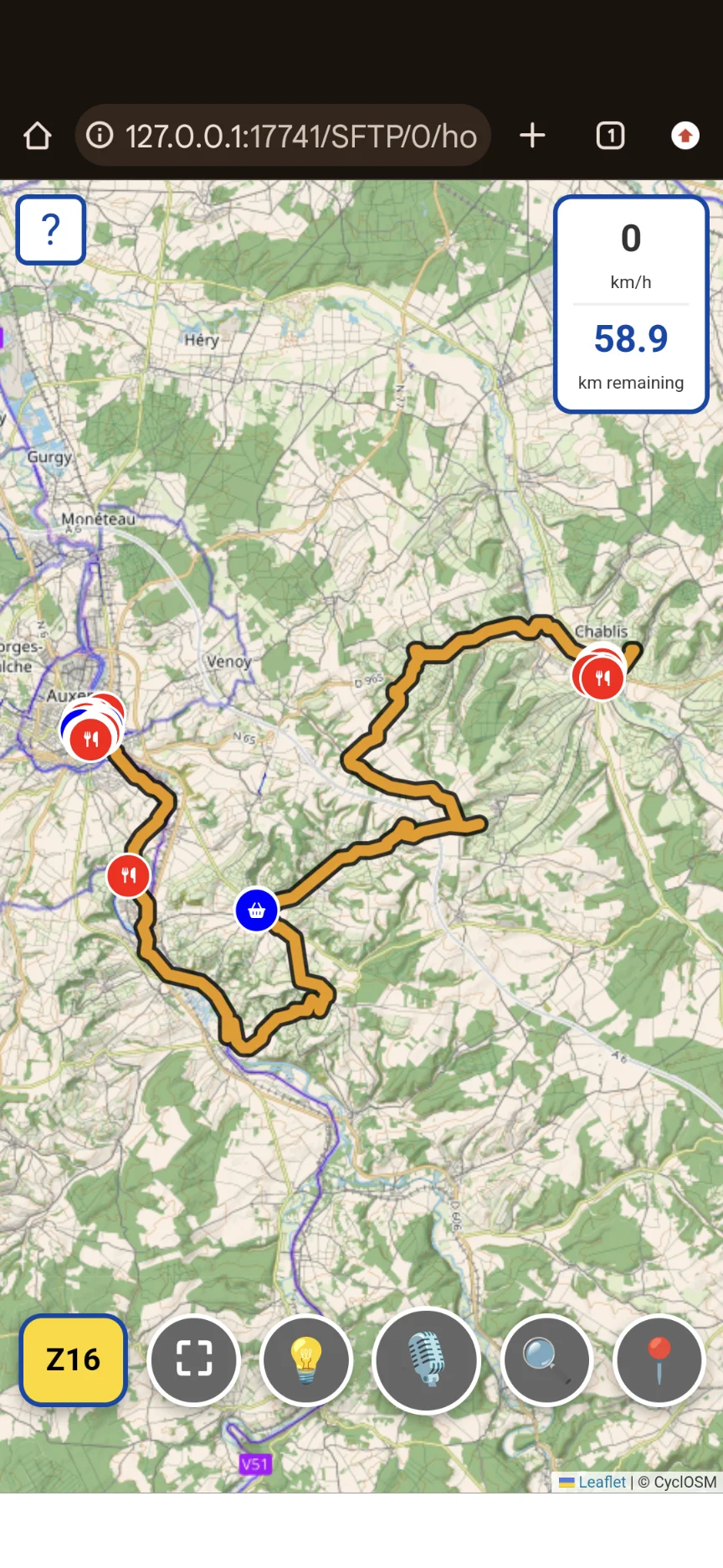 Avec l’icône jaune du coin inférieur gauche, vous pouvez choisir votre niveau de zoom. Chaque pression fait alterner le zoom entre la vue d’ensemble du tracé, le zoom des tuiles téléchargées (16x) et un zoom 18x qui n’est pas celui des tuiles, mais du navigateur (par conséquent l’image s’embrouille légèrement, tout en restant bien visible). Pour naviguer en pleine campagne, le zoom 16 est parfait pour avoir une idée générale de ce qui vient sur le trajet, tandis que le zoom 18 permet de ne pas se tromper aux intersections (très pratique en ville).