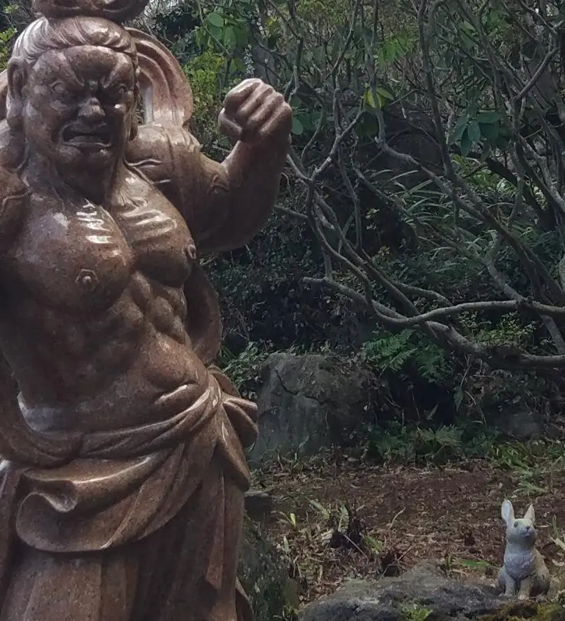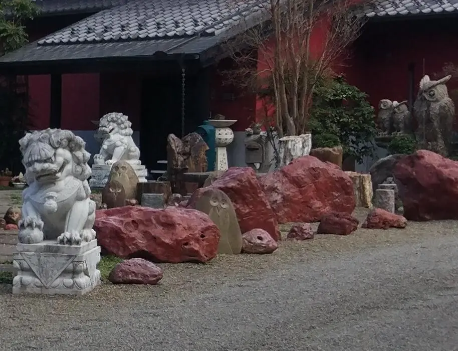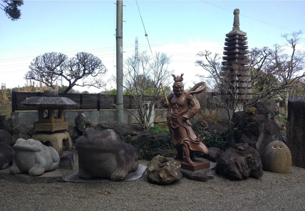 Un bonheur qui, pour nous deux, surgit chaque fois d’un peu n’importe où. Et qui prit la forme, quelques kilomètres plus au sud, de sculptures envahissant littéralement la cour d’un résident de Narita. (Comme son nom complet s’affichait en clair devant sa demeure, j’ai rapetissé la photo pour ne pas trop empiéter sur sa vie privée.)