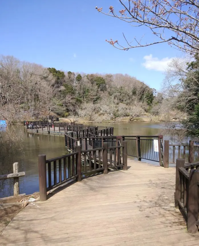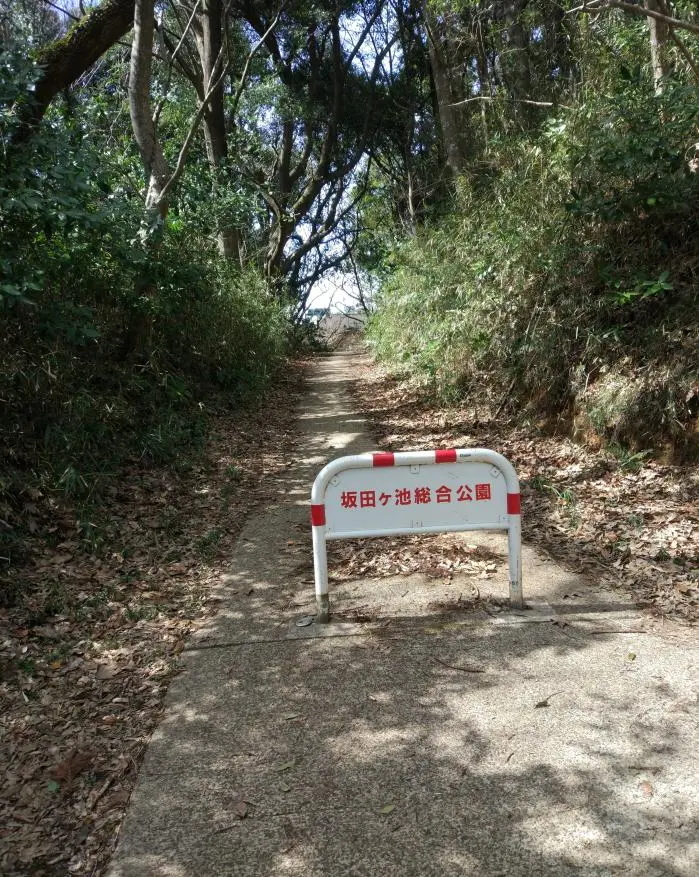 Nous sommes ensuite arrivés au parc Sakatagaike (坂田ヶ池総合公園), que nous avions prévu de traverser pour atteindre notre destination finale, mais, surprise, une affiche interdisait l’accès aux vélos. Il a donc fallu marcher-rouler encore une fois côte à côte. Au milieu du parc, le sentier traversait un étang, puis…