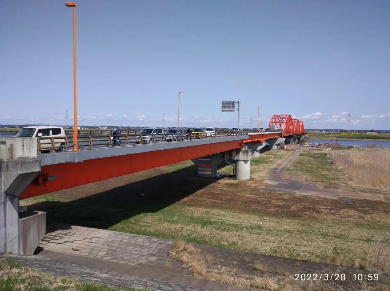 Ce matin-là, le vent soufflait, et soufflait même pas mal fort, du nord-ouest. Il fallait donc partir vers l’est, le long du fleuve Tonegawa. Ce qu’il y a de moche, quand on roule sur la piste dans cette direction-là, c’est qu’il n’y a rien, ou presque rien. Toutes les habitations et agglomérations se trouvent loin de la piste, alors le cycliste regarde soit le fleuve, soit les herbes, soit les deux. Et parfois un pont, comme celui-ci : le pont Nagatoyobashi (長豊橋).