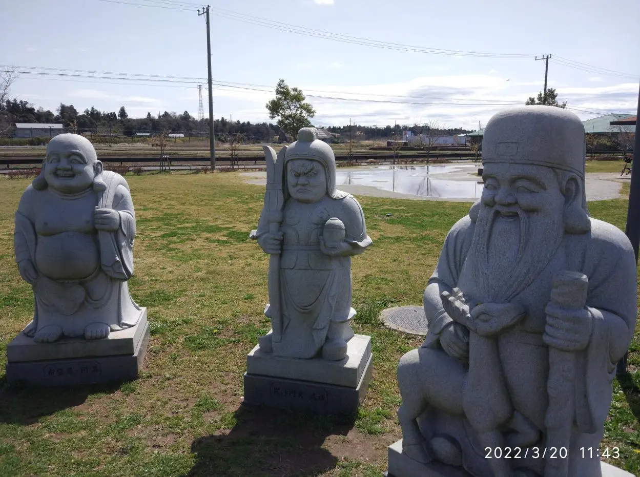 Un plan, gravé dans la pierre, indiquait l’emplacement des temples locaux dédiés à chacune de ces divinités, de la gare Namegawa de JR, du fleuve Tonegawa et du parc lui-même (親水公園). Un peu moins pratique que le GPS pour s’orienter, mais pas mal plus joli.
