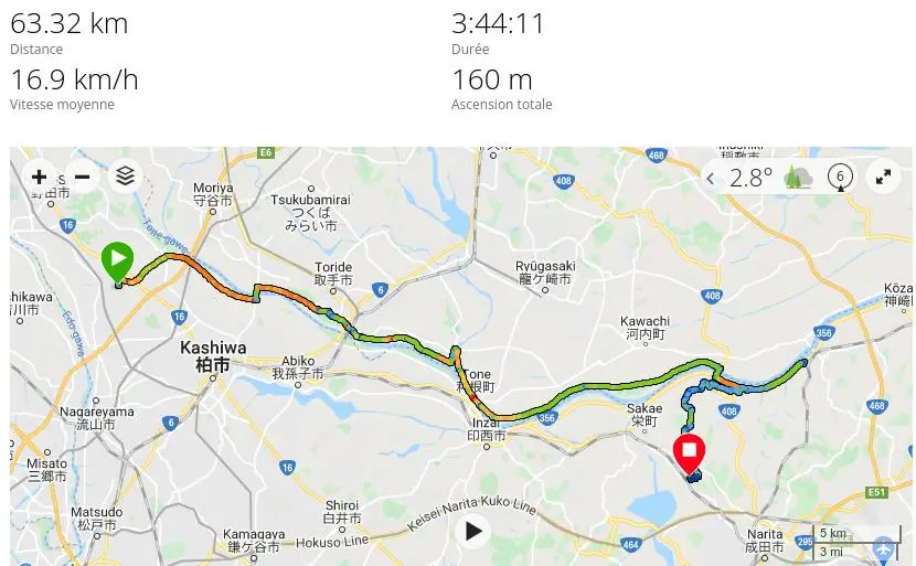 Nous venions de le traverser et nous nous trouvions à l’endroit où notre parcours quittait enfin la piste en direction de Narita, en coupant à travers les paysages ruraux. Mais comme le parcours prévu était très court, à peine 56 km, nous avons décidé de le rallonger un peu en continuant un peu vers l’est, histoire d’aller casser la croûte dans un parc.